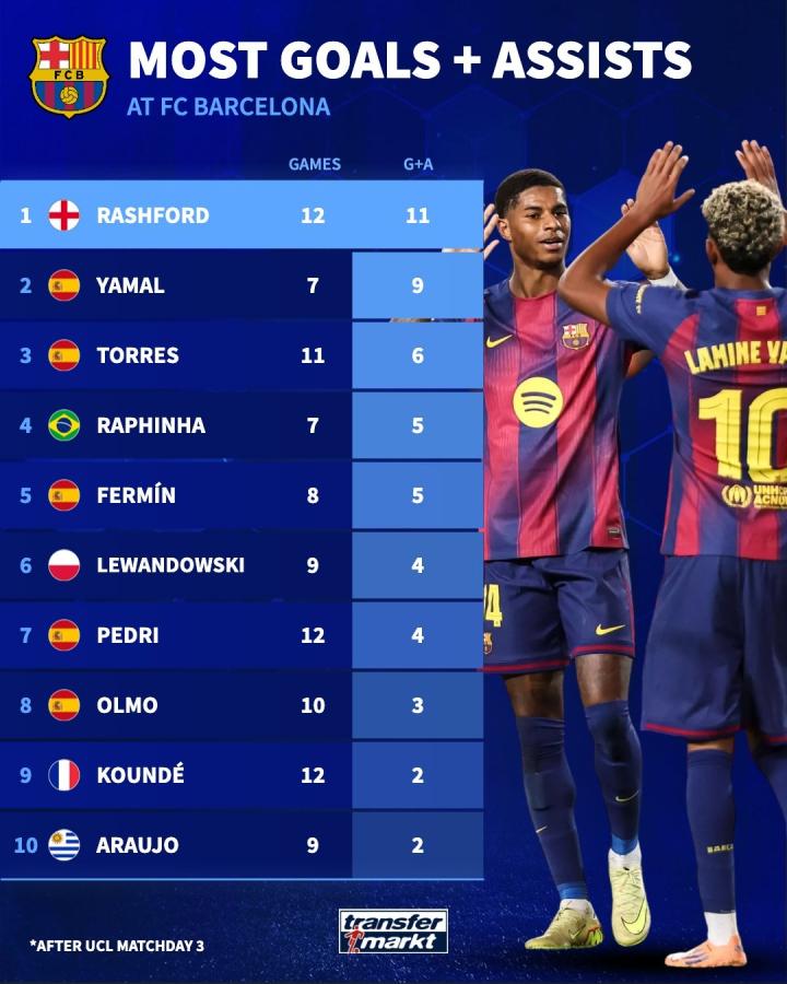 数据显示,本赛季截至目前,拉什福德已代表巴塞罗那出场12次,攻入5球并送出6次助攻,其直接参与进球数位列全队首位。